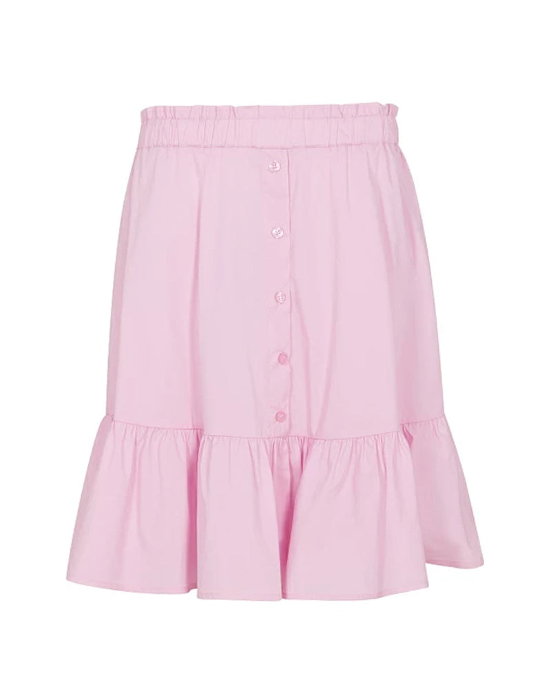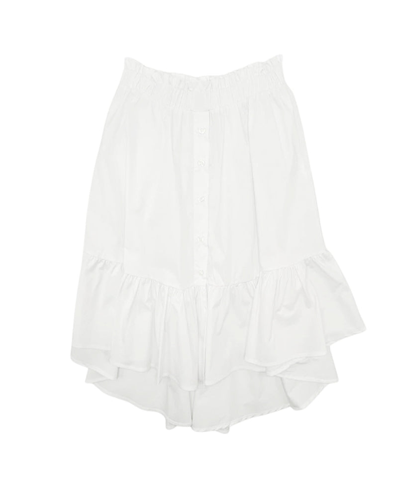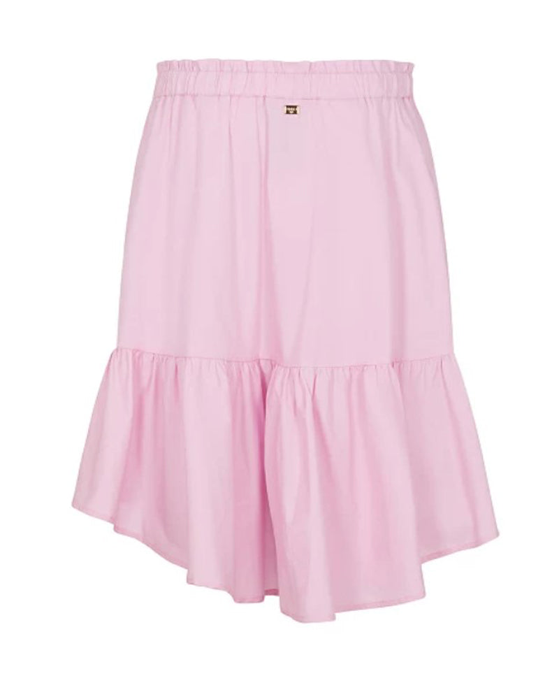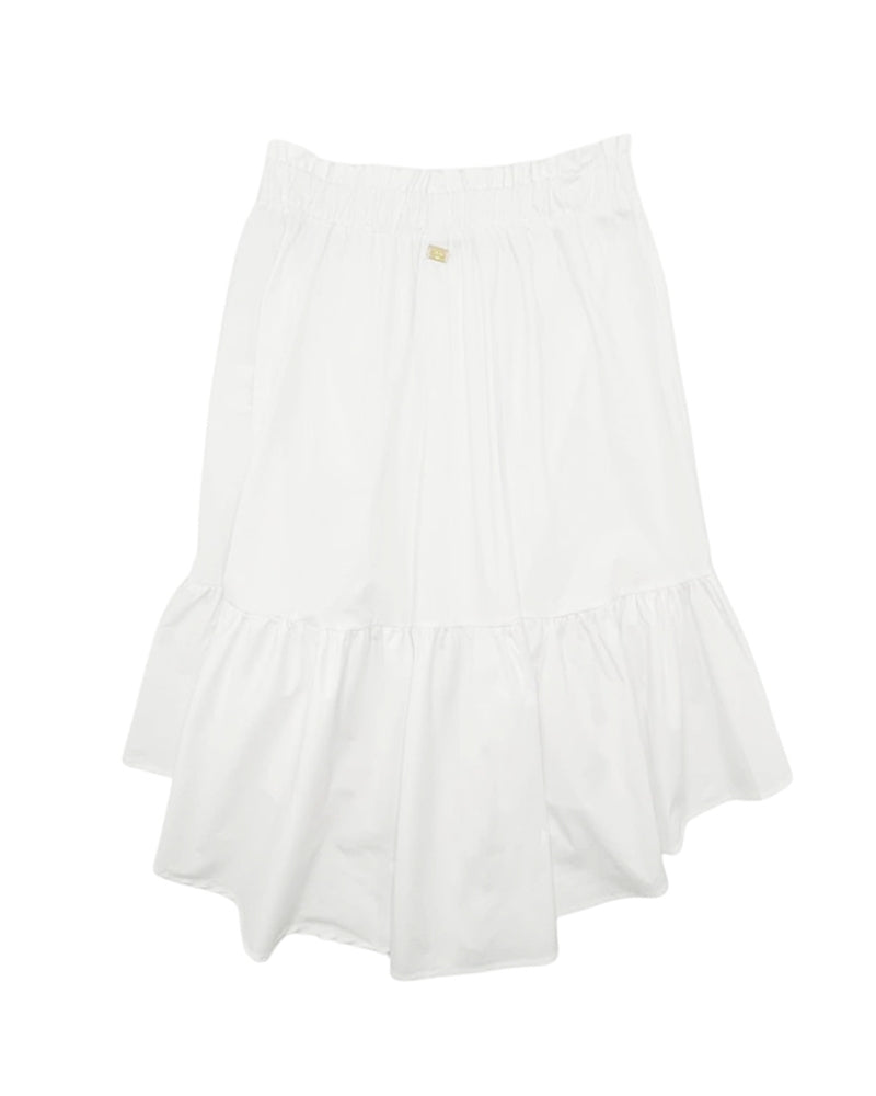 Gonna in leggerto cotone, lunghezza midi, vita elasticizzata, taglio asimmetrico sul retro.