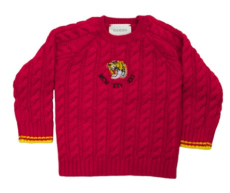 Crew neck sweater, cable pattern, embroidery on the front, buttons on the shoulder.