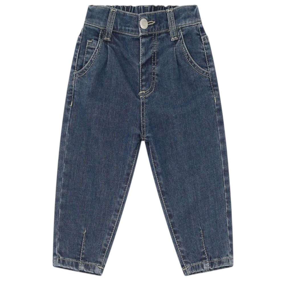 Jeans realizzati in denim blu, caratterizzati da vita elasticizzata, chiusura frontale con bottone a pressione e zip, due tasche laterali oblique e due tasche applicate sul retro. Sono decorati con placca logo in metallo applicata sul retro.