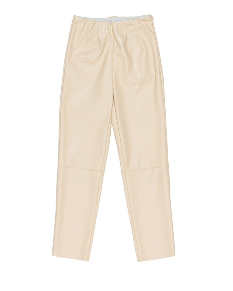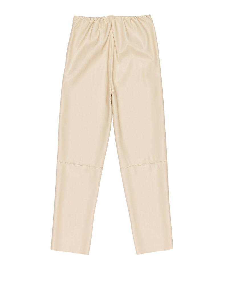 Leggings beige da bambina realizzati in similpelle, sono caratterizzati da vita elasticizzata, chiusura con zip laterale, fodera in pile e cuciture sovrapposte.