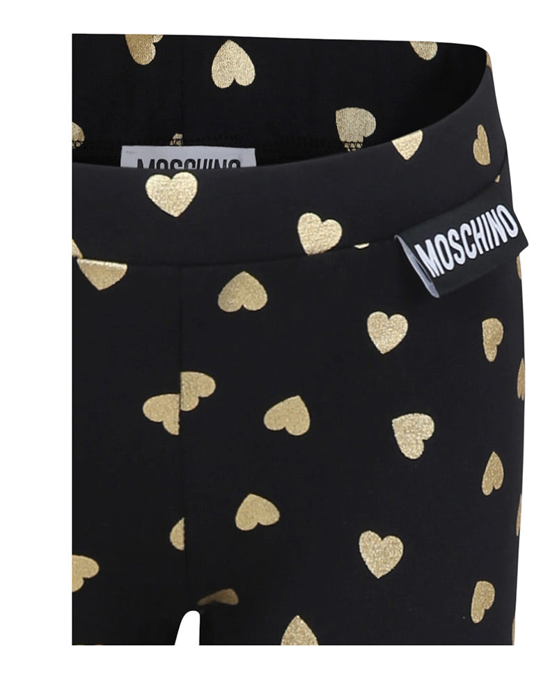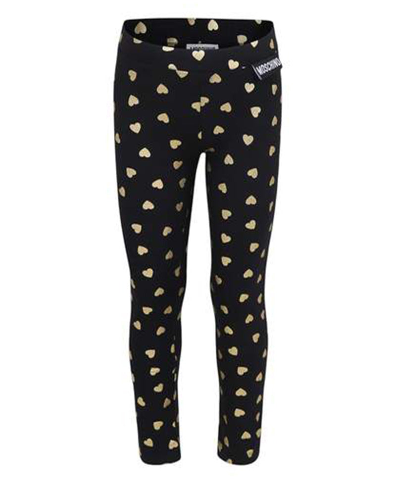 Leggings realizzati in cotone elasticizzato da bambina. Presentano vita elasticizzata, stampa a cuori glitter all-over, applicazione patch logo sulla parte anteriore.