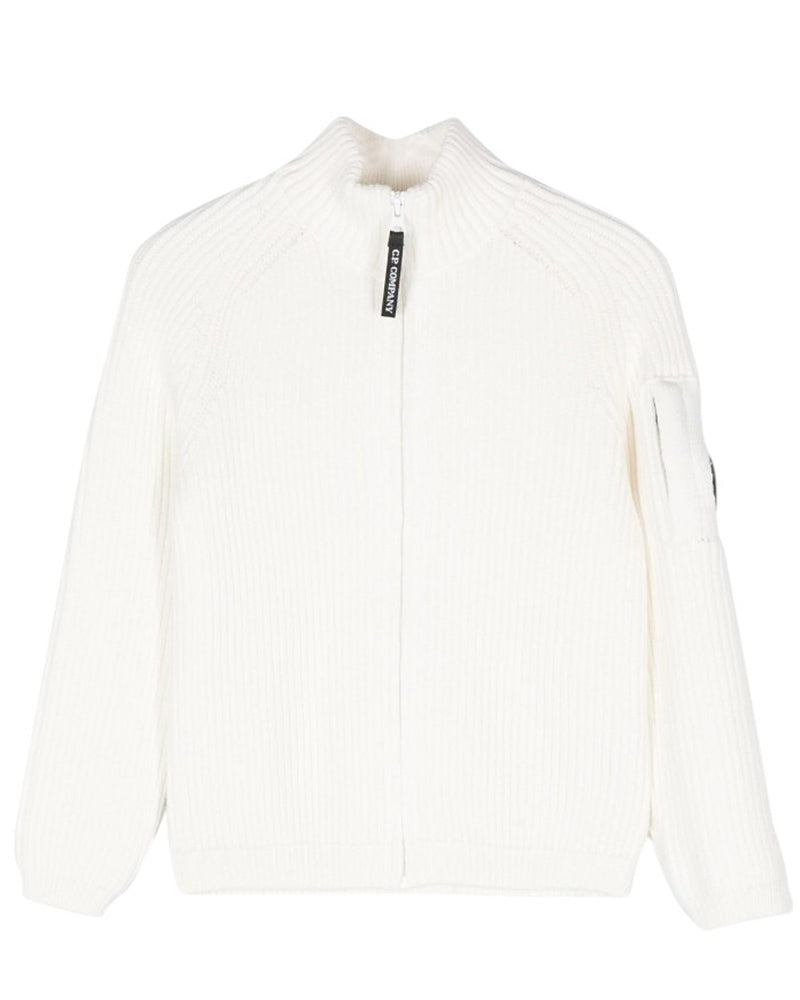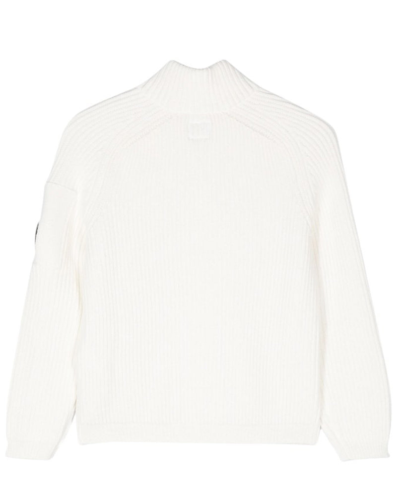 Maglia bianca da bambino realizzata in misto cotone. Presenta design a coste, collo alto, chiusura frontale con zip, maniche lunghe e finiture a costine. È decorata con lente C.P. Company applicata sulla manica.