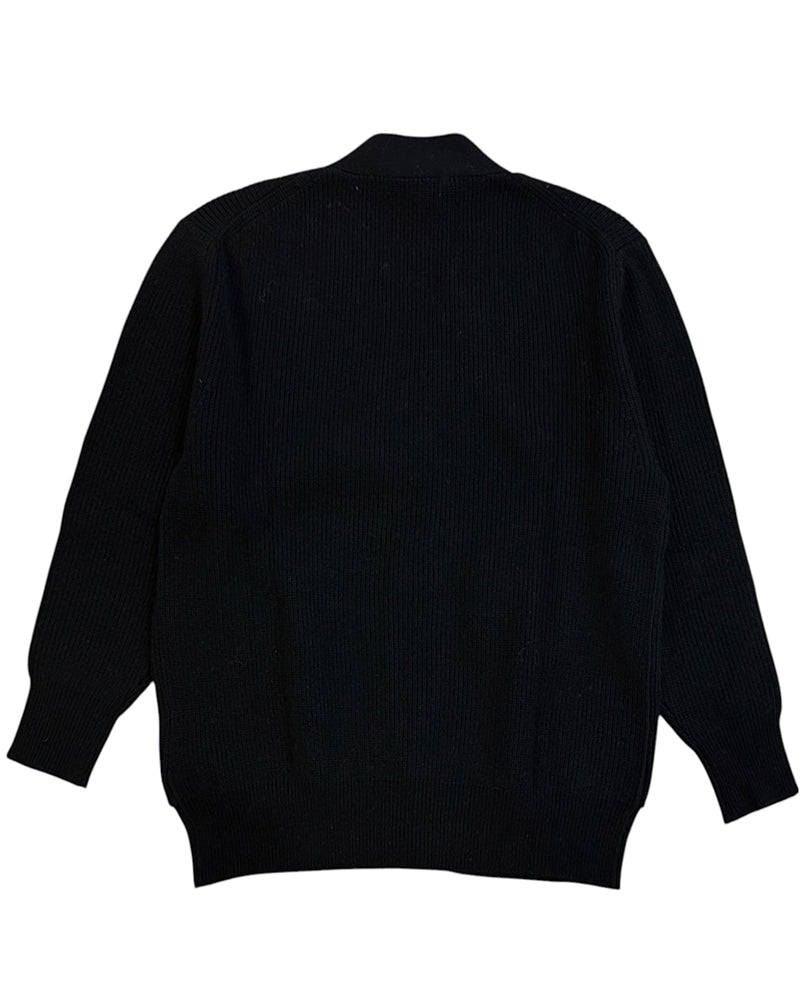 Cardigan nero da bambino realizzato in misto lana. Presenta design a coste, scollo a V, chiusura frontale con bottoni, maniche lunghe, due tasche applicate sul davanti e finiture a costine. È decorato con logo ricamato sul davanti.