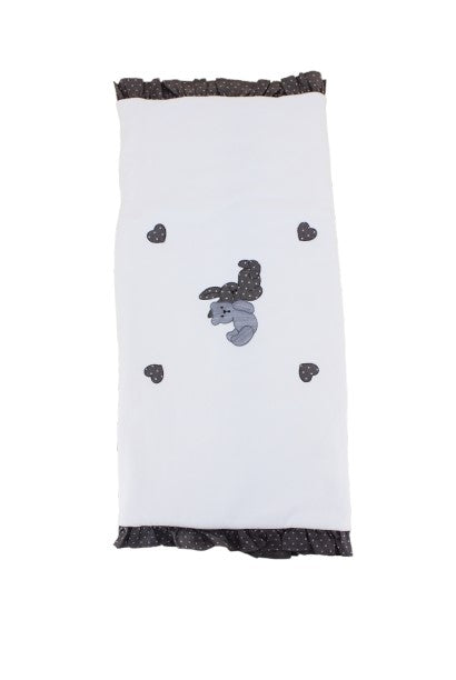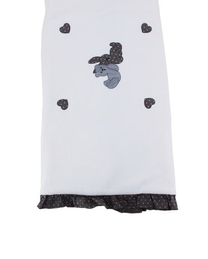 Simple and elegant model with teddy bears applied in the centre and a dove-grey ruffled border with polka dots.