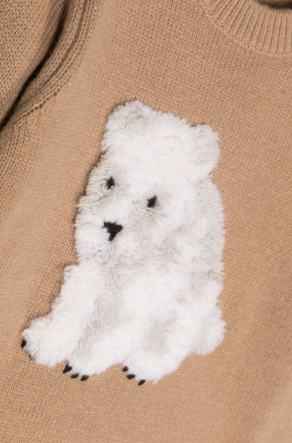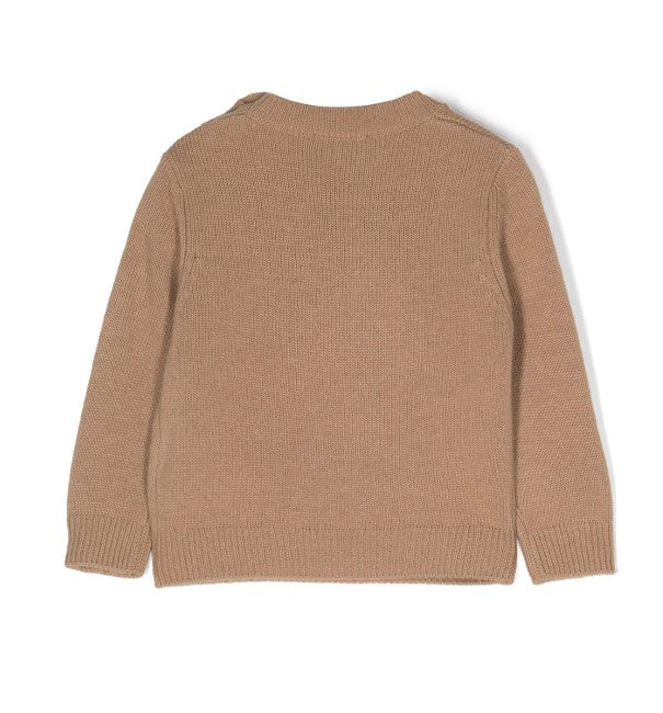 Crew neck wool sweater with embroidery and appliques on the front, button fastening on the shoulder strap.