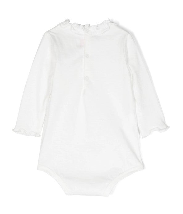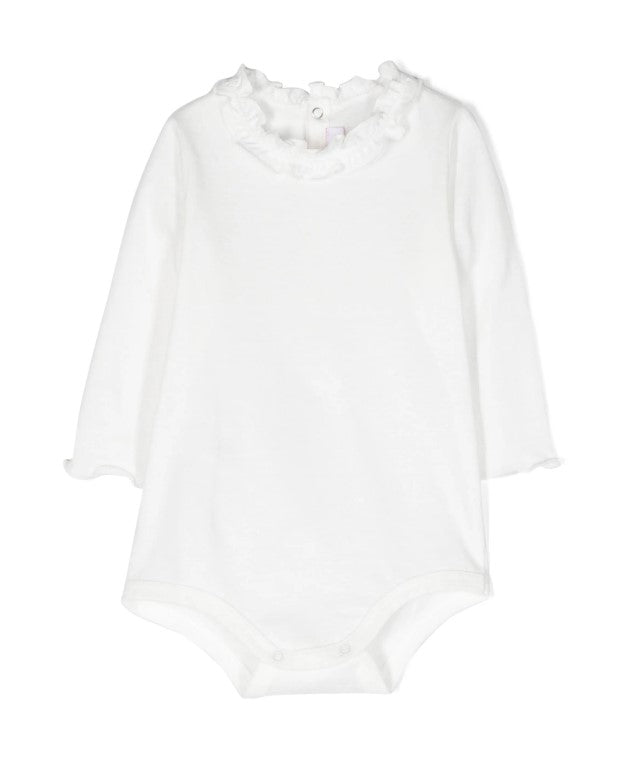 Long-sleeved bodysuit T-shirt with ruffles at the neck and sleeves, clip fastening at the crotch and back.