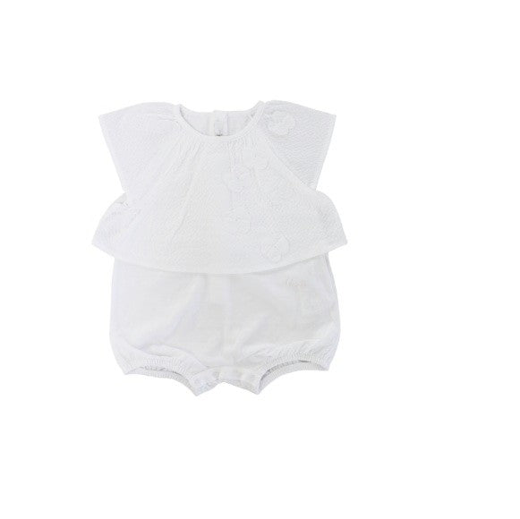 Owl romper without collar, cap sleeve, top model jacket with flowers applied on the side, bottom in fresh cotton jersey