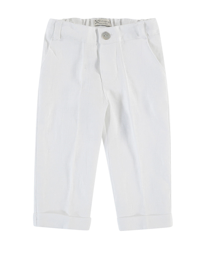 Pantaloni in lino di taglio classico, chiusura con bottoncino frontale, tasche america, piega alla francese.