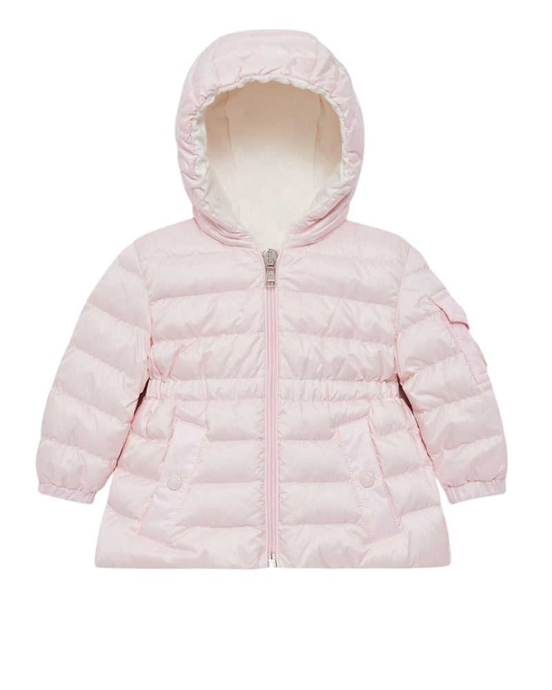 Light pink "Dalles" jacket by Moncler Enfant. Fastened by a zip, this model features two pockets with snap button, a pocket on the sleeve with flap, a logo patch, an elasticated waistband, ribbed cuffs and a white cotton lining.