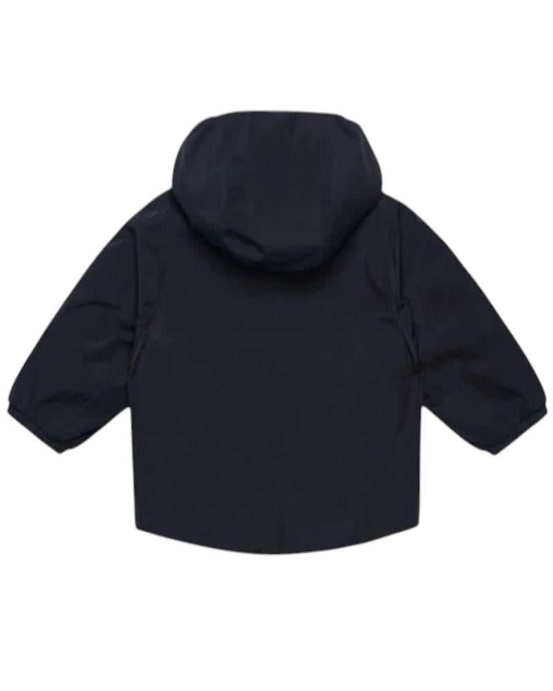 Il giubbino da neonato E. Jack ST Thermo Reversibile è realizzato in nylon impermeabile, idrorepellente e antivento, garantendo protezione e comfort in ogni condizione climatica. Il capo presenta un lato in tessuto tecnico liscio e l'altro in nylon trapuntato a contrasto, entrambi traspiranti e con imbottitura in piuma per un alto grado di calore. Le cuciture termonastrate assicurano impermeabilità, mentre il cappuccio fisso, la chiusura con zip e i polsi elastici offrono una vestibilità slim e funzionale. Completano il design due tasche con zip, due con bottoni a pressione e il logo in silicone bianco.