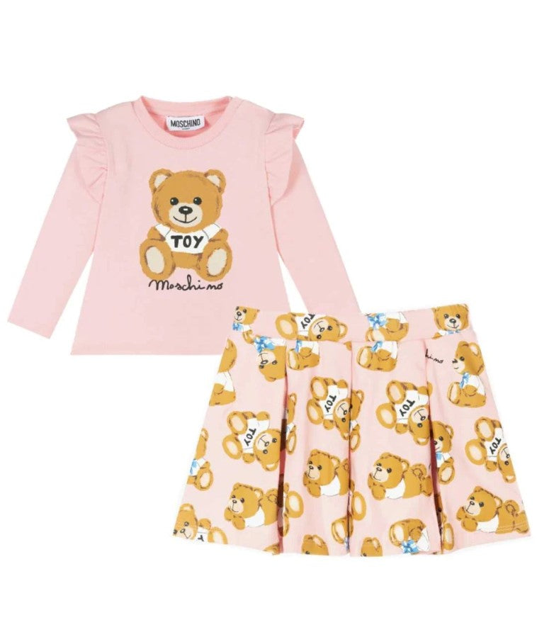 Two-piece set with all-over patterned skirt, crew neck t-shirt with print on the front.