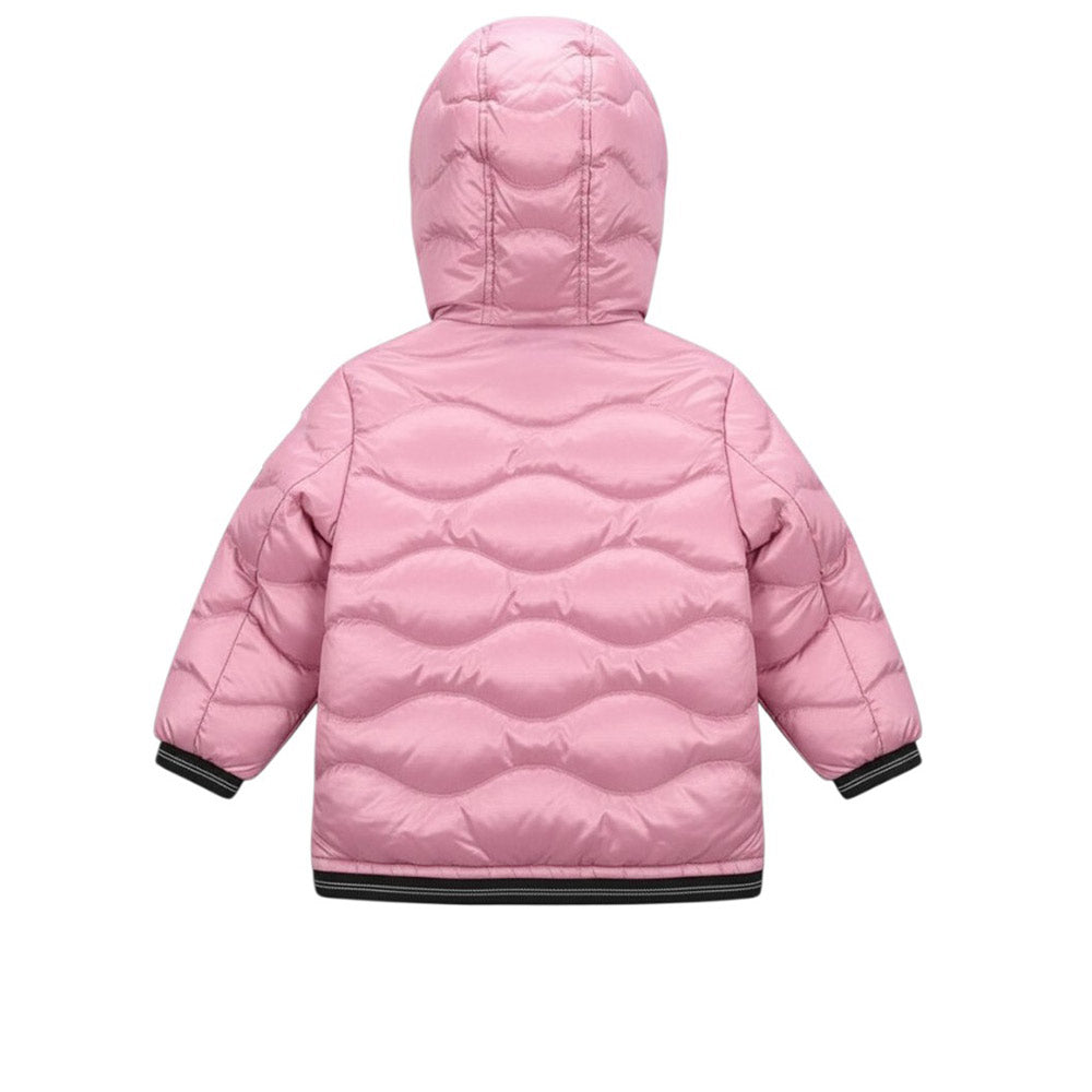 Giubbino 100 grammi CAMELIA per neonata, realizzato in nylon. Presenta design trapuntato a onde, cappuccio fisso, chiusura frontale con zip, maniche lunghe, fodera in nylon a contrasto colore, due tasche laterali a filetto con zip e finiture in fettuccia elasticizzata a righe. È decorato con linguetta logo applicata sul petto e patch sulla manica.