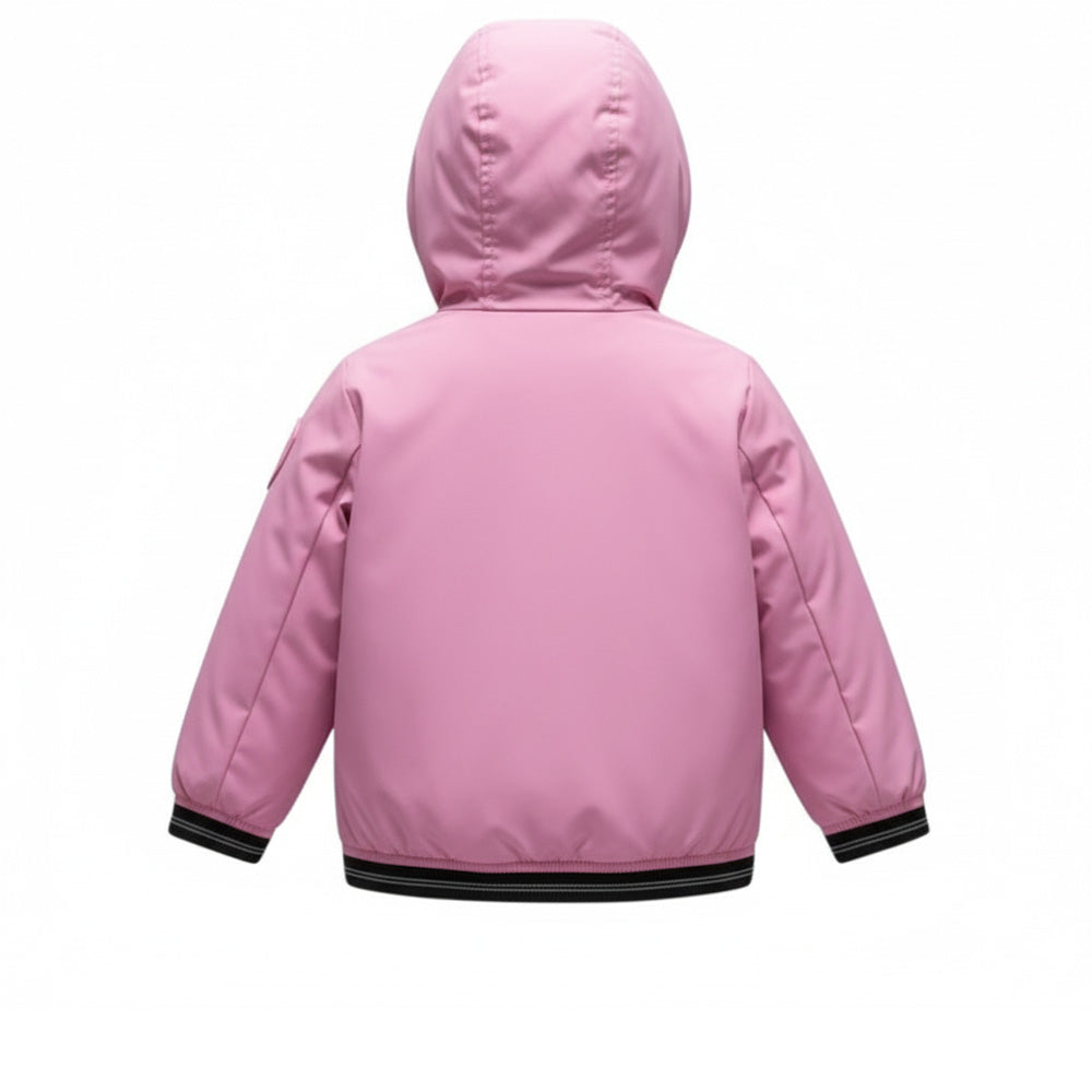 Giubbino antivento ANDREW per neonata, realizzato in nylon. Presenta cappuccio fisso, chiusura frontale con zip, maniche lunghe, fodera in jersey, due tasche laterali a filetto con zip e finiture in fettuccia elasticizzata a righe. È decorato con linguetta logo applicata sul petto e patch sulla manica.
