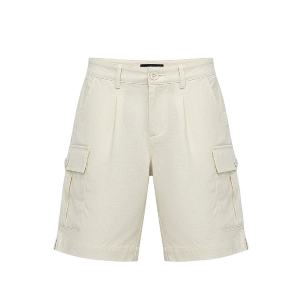 Bermuda realizzato in misto lino, caratterizzato da chiusura frontale con bottone e zip, vita regolabile grazie ad elastico interno con bottoncini, due tasche laterali all'americana e due tasche cargo sui lati.