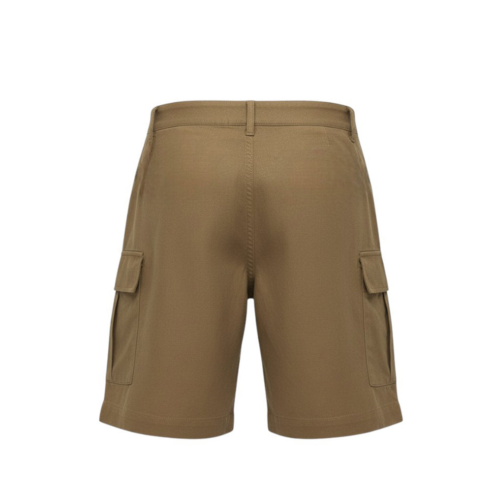 Bermuda realizzato in misto lino, caratterizzato da chiusura frontale con bottone e zip, vita regolabile grazie ad elastico interno con bottoncini, due tasche laterali all'americana e due tasche cargo sui lati.