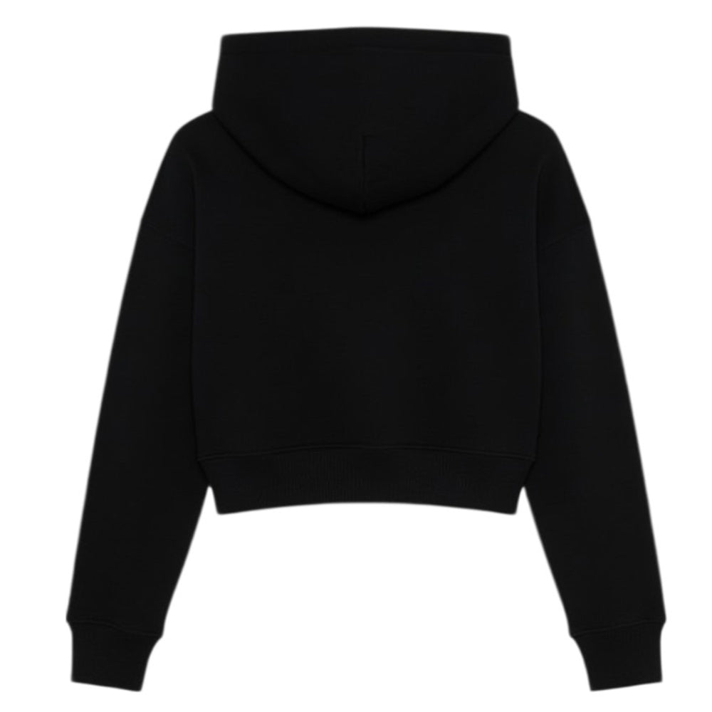 Felpa cropped realizzata in cotone sgarzato, caratterizzata da ampio cappuccio, maniche lunghe, polsi e orlo a coste. È decorata con applicazione strass e logo stampato sul petto.