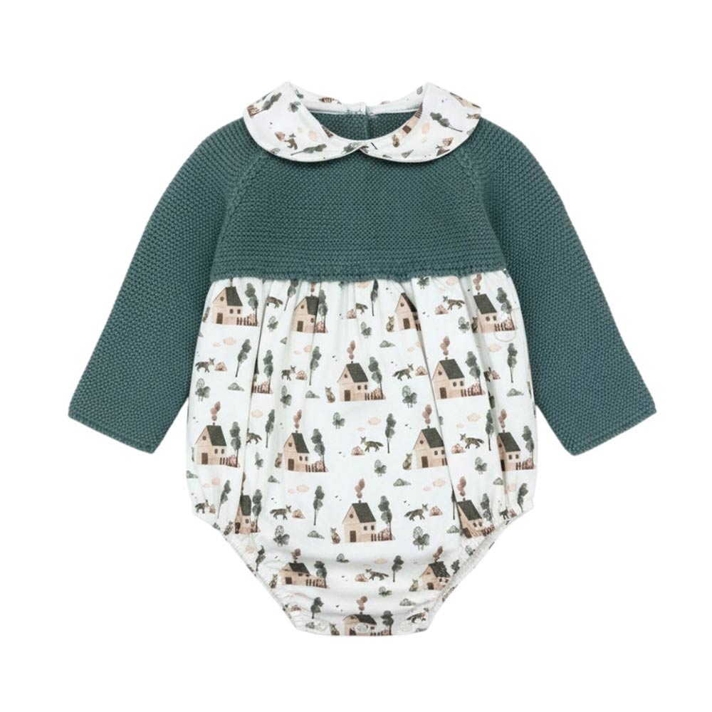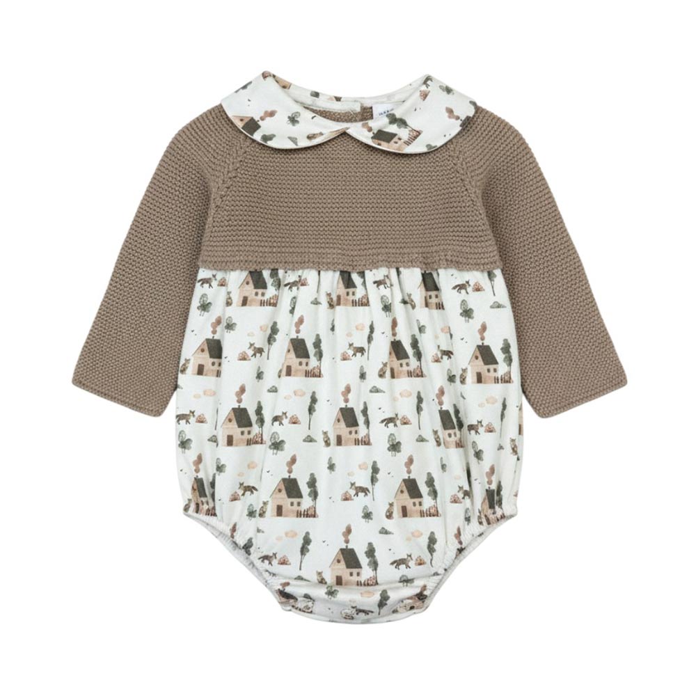 Pagliaccetto a culotte BABY FASHION in misto lana e caldo cotone. Il sopra in maglia tinta unita, con colletto rotondo a fantasia. Il sotto a fantasia casette.