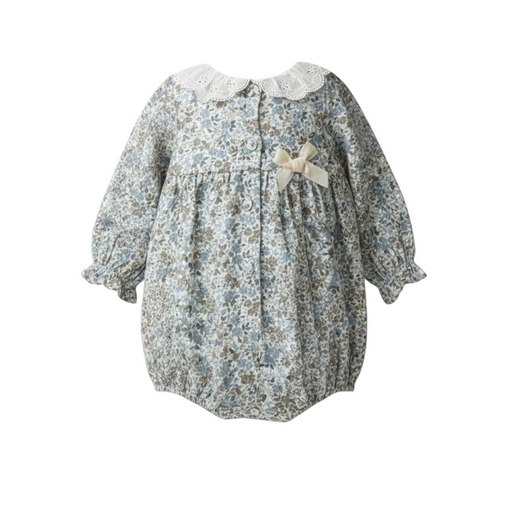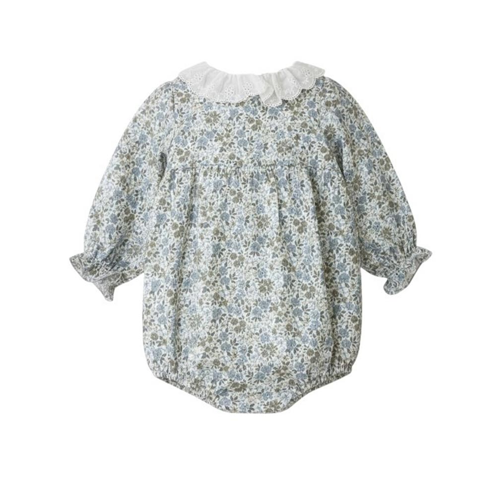 Pagliaccetto con fantasia provenzale, caratterizzato da colletto con ruches in pizzo di sangallo, chiusura con bottoncini sul davanti e maniche lunghe con polsini elasticizzati.