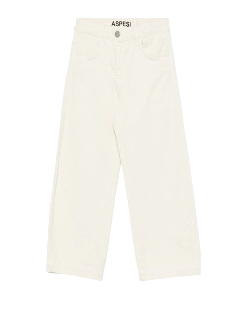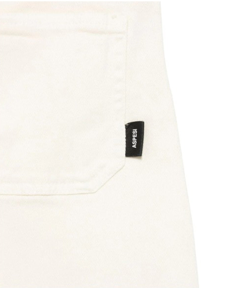 Pantaloni avorio realizzati in denim di cotone. Presentano chiusura frontale con bottone e zip, vita regolabile grazie ad elastico interno con bottoni, due tasche laterali oblique e due tasche applicate sul retro. Sono decorati con label logo applicata sulla parte posteriore.