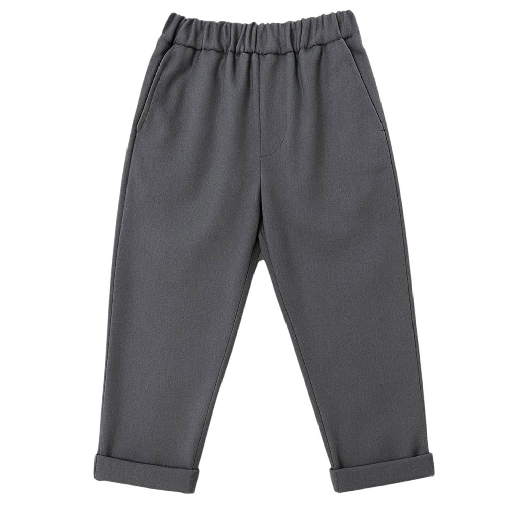 Pantaloni realizzati in fresco di lana, caratterizzati da vita elasticizzata, due tasche laterali a filetto e fondo con risvolto.