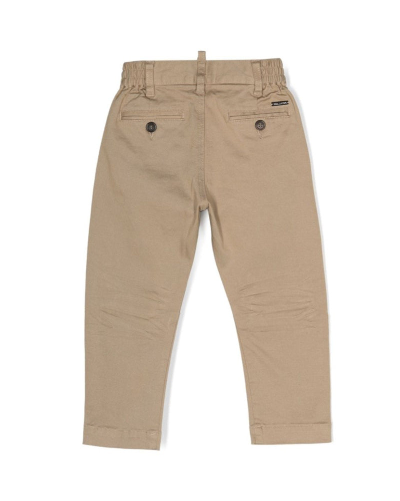 Pantaloni realizzati in cotone da neonato. Presentano vita elasticizzata sul retro, passanti per la cintura, chiusura frontale con bottone e zip, tasche laterali a filo e tasche con bottoncini sul retro. Sono decorati con logo in metallo applicato sulla parte posteriore.