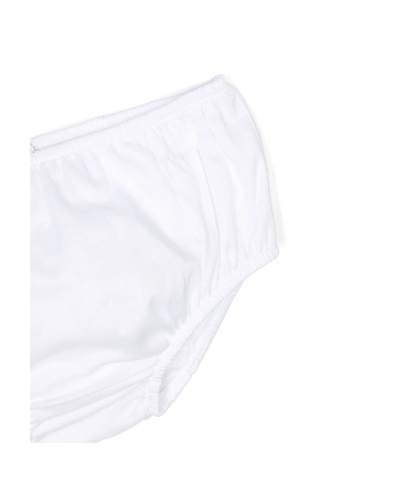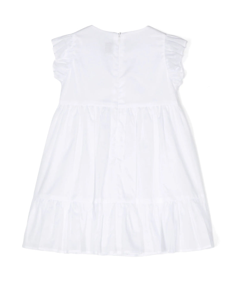 Vestina svasato in cotone con dettagli a pieghe e arricciature. Scollo rotondo, maniche corte e linea A. Fodera completa, mutandine abbinate e chiusura posteriore con cerniera nascosta.