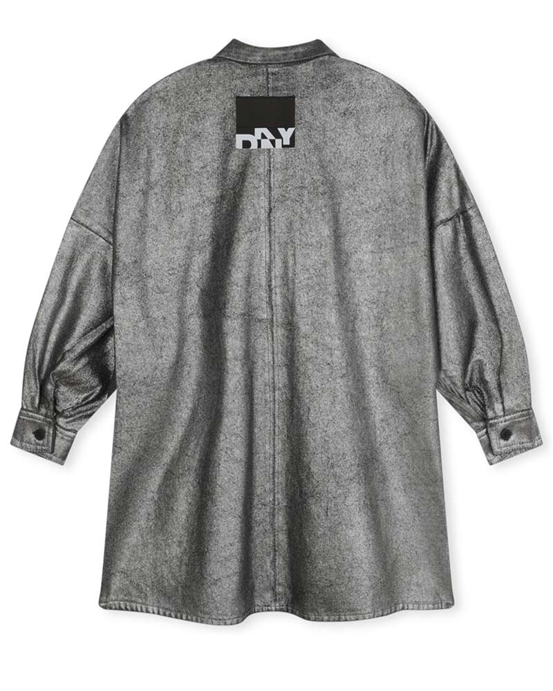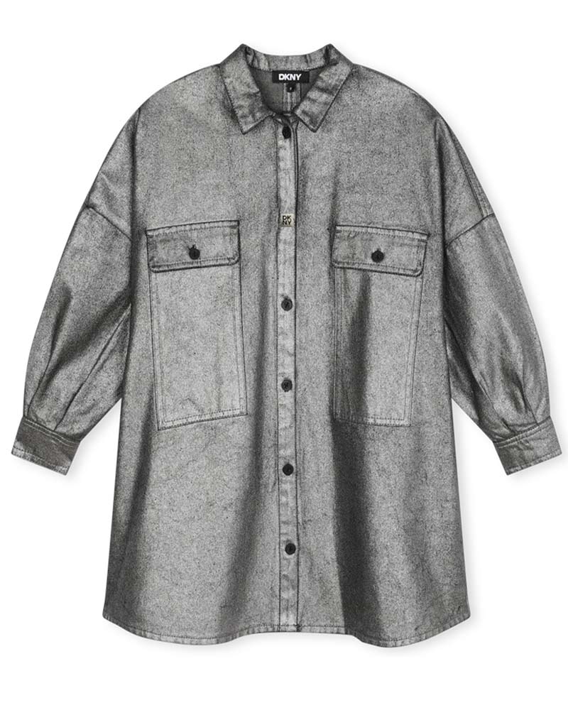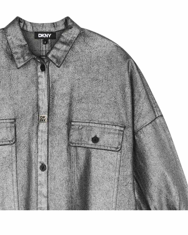 Abito da bambina realizzato in denim di cotone effetto metallizzato. Presenta colletto a punta, chiusura frontale con bottoni, maniche lunghe e due tasche con patta applicate sul petto.
