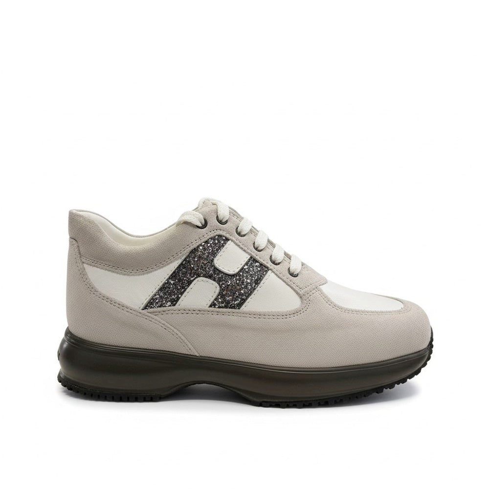 La tomaia è realizzata in un mix di pelle scamosciata grigia chiara e tessuto tecnico. La caratteristica “H” laterale, è definita da un inserto in glitter nero o grigio scuro. Gli inserti bianchi in pelle liscia. La scarpa presenta una suola in gomma di circa 6 cm e un plantare interno estraibile e rialzato di circa 2 cm