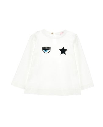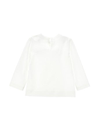Crew neck T-shirt, long sleeve, embroidered symbol on the front, button fastening on the back.
