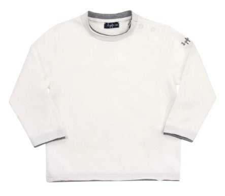 Crew neck m/s T-shirt, with contrasting hem and embroidered logo on the sleeve. With embroidery on the front and fastening clips on the shoulder.