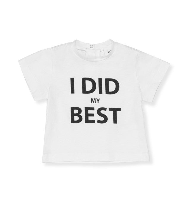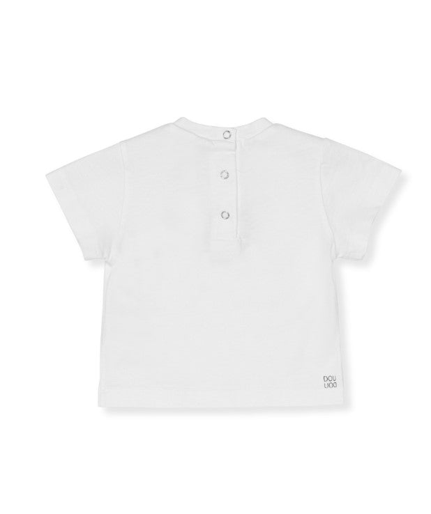 Crew neck, short sleeve T-shirt, clip closure on the back, front print.