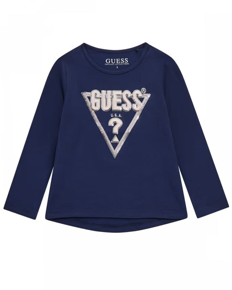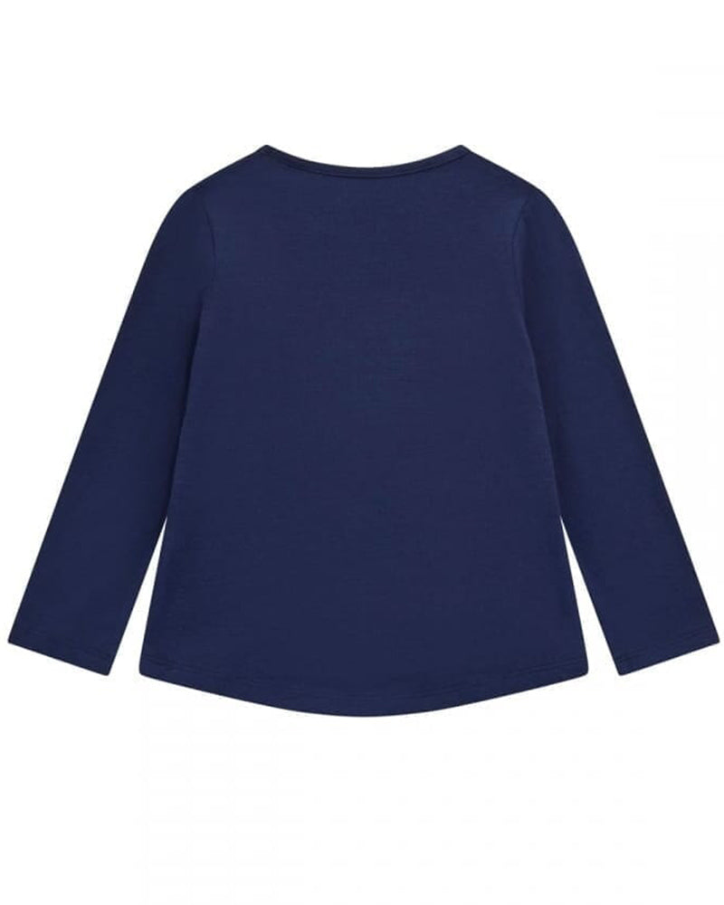 T-shirt girocollo a maniche lunghe da neonata, realizzata in jersey di cotone, caratterizzata da chiusura con clips sulla spallina, applicazione logo con dettagli di paillettes sulla parte anteriore e orlo curvo.