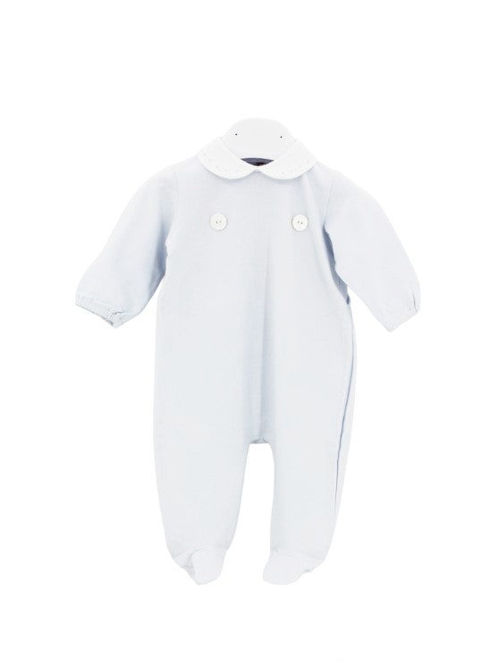 Little Bear babygrow in sky blue cotton with white collar and buttons.