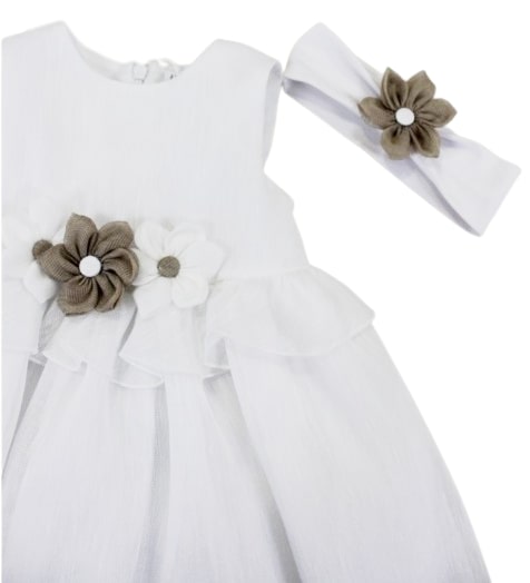 NEWBORN DRESS WITH FLOWERS ON THE FRONT COMPLETE WITH HEADBAND