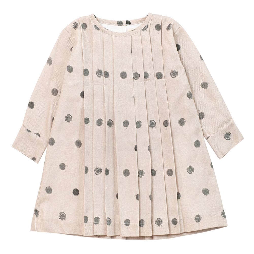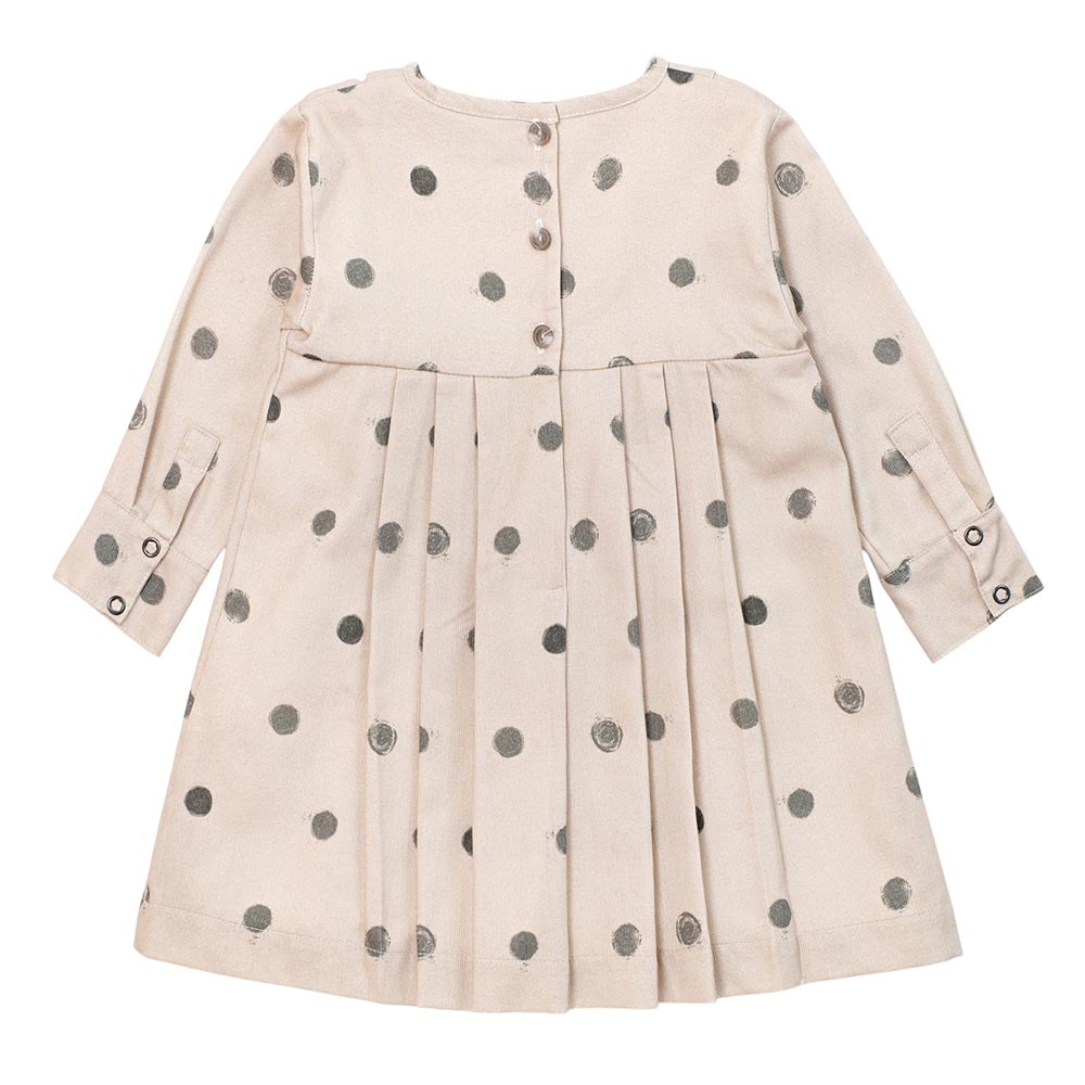 Abito realizzato in caldo cotone, caratterizzata da collo rotondo, maniche lunghe e chiusura con bottoncini sul retro. È decorato con fantasia a pois all-over.