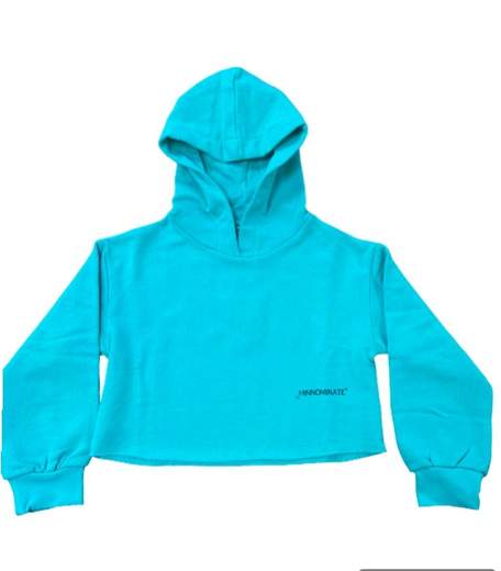 Kurz geschnittenes Sweatshirt mit langärmliger Kapuze, ungesäumtem Saum und aufgedrucktem Logo auf der Vorderseite.
