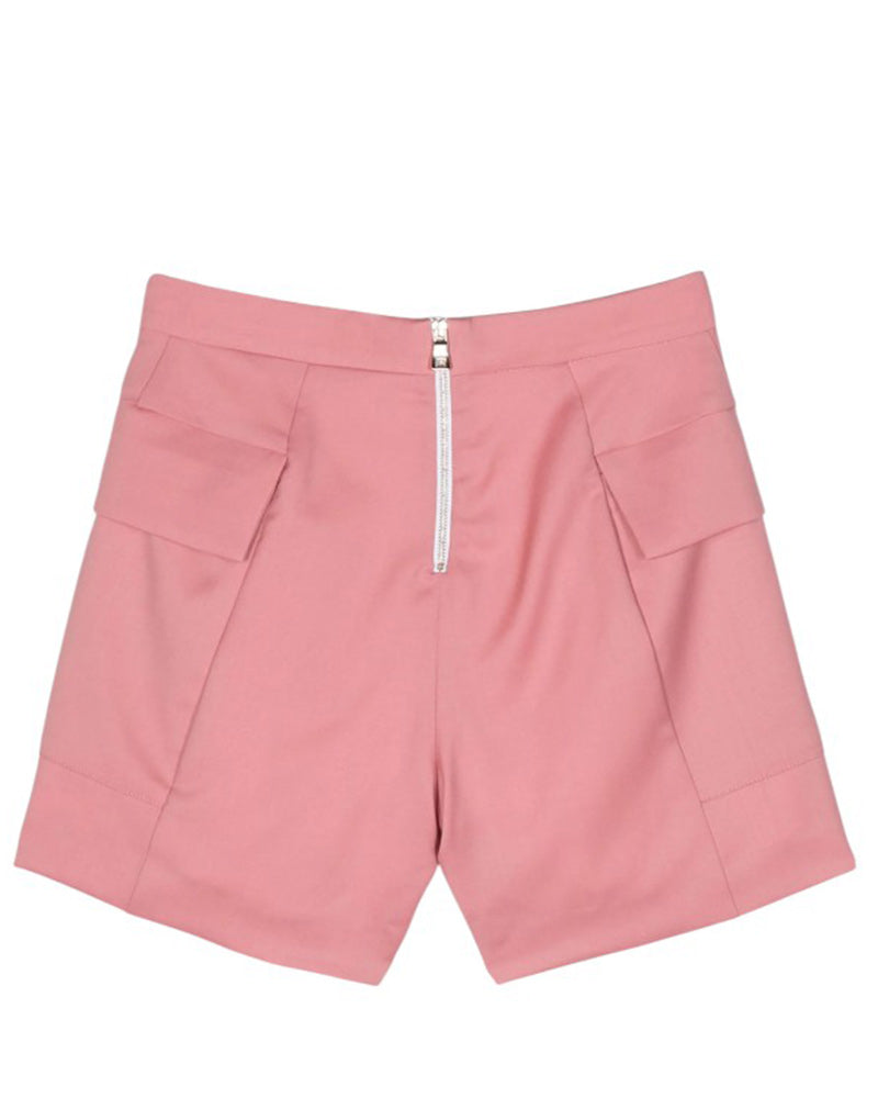 Shorts rosa da bambina realizzati in fresco di lana, con chiusura con zip sul retro e due tasche laterali con patta. Sono decorati iconici bottoni oro sulla parte anteriore.