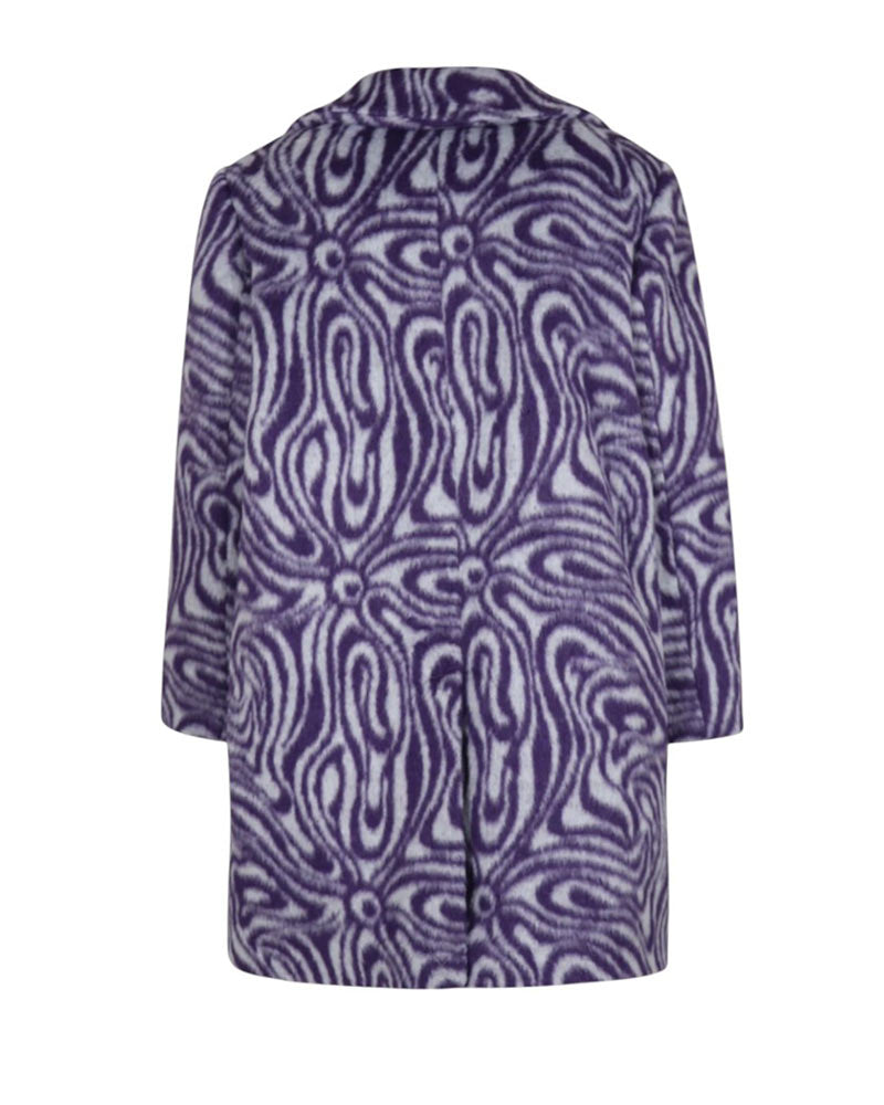 Cappotto viola da bambina realizzato in panno effetto spazzolato. Presenta motivo marmo all-over, collo a revers, chiusura frontale con bottoni, maniche lunghe e due tasche frontali a filo.