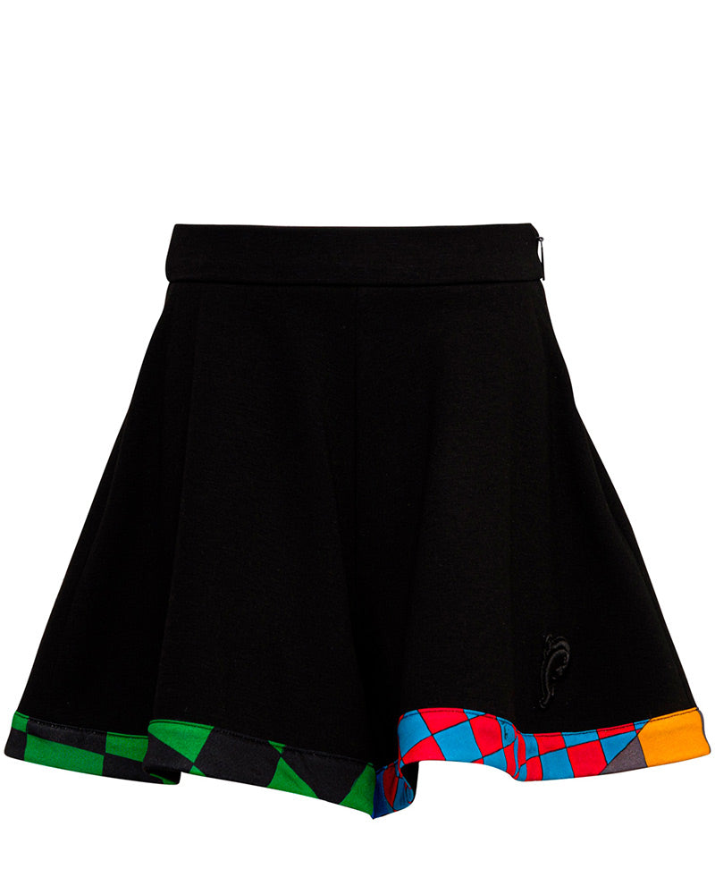 Shorts neri da bambina realizzati in jersey di viscosa, sono caratterizzati da taglio svasato, chiusura laterale con zip e orlo a contrasto con stampa grafica. Sono decorati con patch logo applicata sulla parte anteriore.