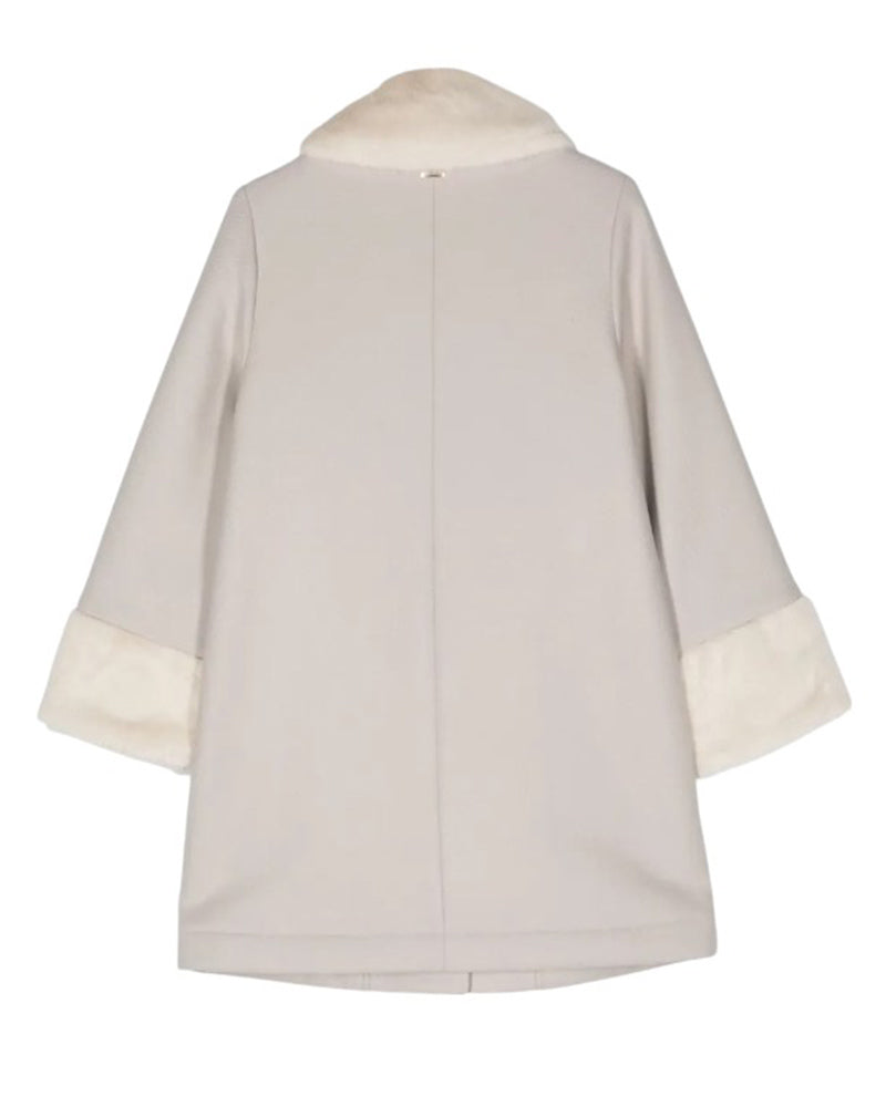 Cappotto monopetto da bambina realizzato in twill di lana vergine. Presenta colletto in pelliccia sintetica, design imbottito, chiusura frontale con bottoni, maniche lunghe con polsi in pelliccia sintetica, due tasche laterali a filetto e orlo dritto. È decorato con placca logo applicata sul petto.