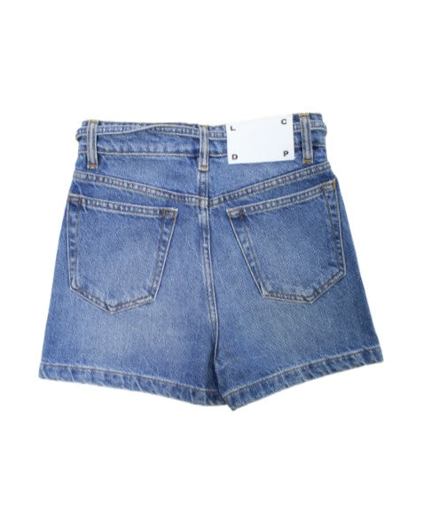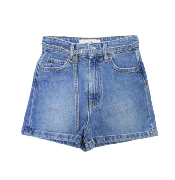 Baumwoll-Denim-Shorts, Modell mit fünf Taschen, Reißverschluss und Knopf vorne, angesetzter Hüftgurt.