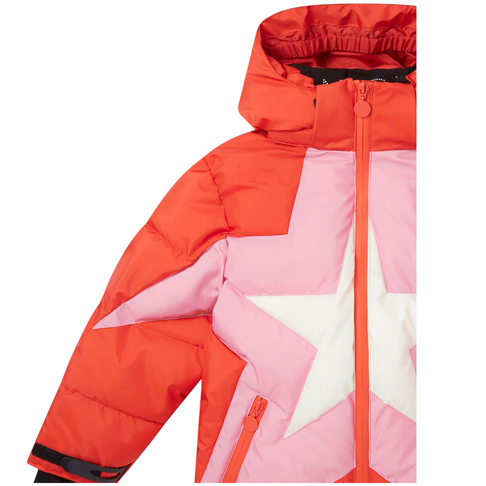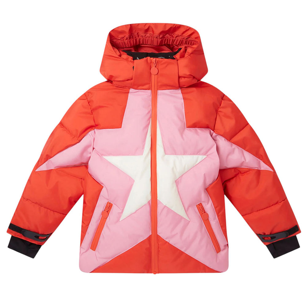 Giubbino imbottito Sci da bambina. Presenta design trapuntato, cappuccio rimovibile, collo alto, maniche lunghe con manicotti, chiusura frontale con zip, due tasche frontali, orlo elasticizzato. È decorato con stella in rilievo sulla parte anteriore.