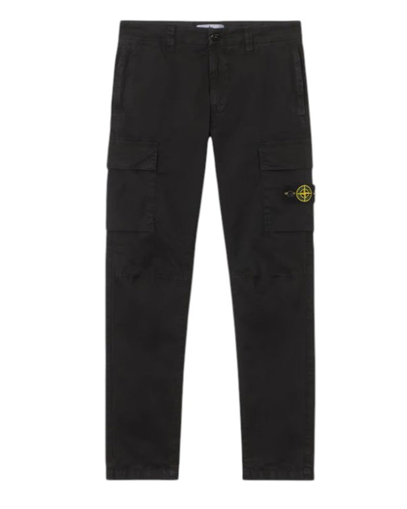 Pantaloni Stone Island, cargo, chiusura con zip e bottone, tasche laterali a contrasto, patch logo removibile sulla tasca laterale.
