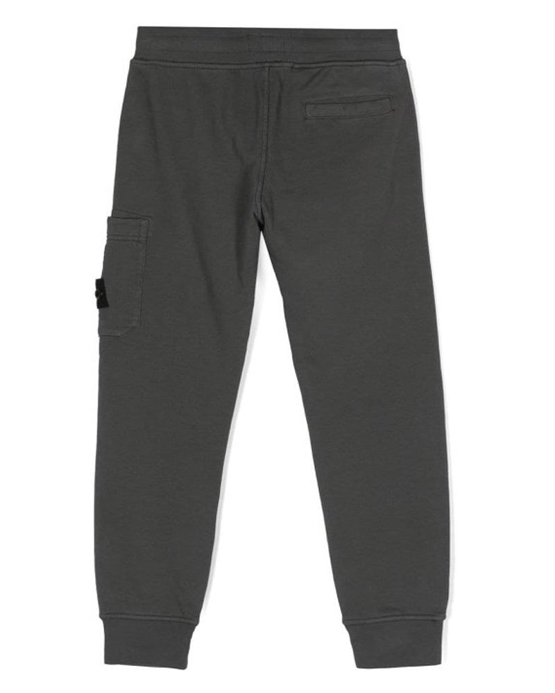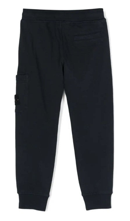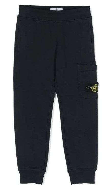 Pantalone bimbo jogger in felpa di cotone. Modello cargo con elastico in vita ed alla caviglia. Due tasche laterali a filetto, un tascone sulla gamba con patch logo rimovibile.