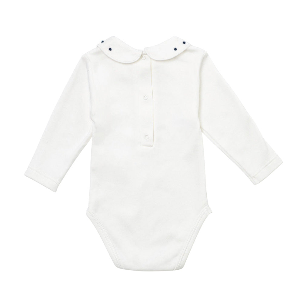 Body avorio realizzato in jersey di cotone. Presenta colletto Peter Pan con pois ricamati a contrasto, maniche lunghe e chiusura con bottoncini a pressione tra le gambe e sul retro.