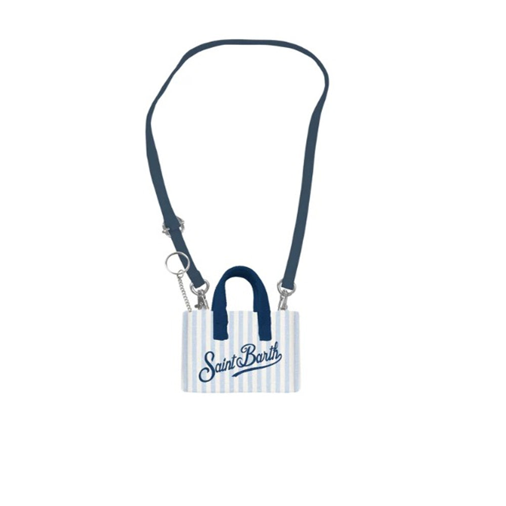 Micro borsa porta chiavi a tracolla in lino. Presenta fantasia a righe all-over, tracolla regolabile e removibile, portachiavi all'interno, chiusura velcro. È decorata con logo ricamato sulla parte anteriore e sul retro.