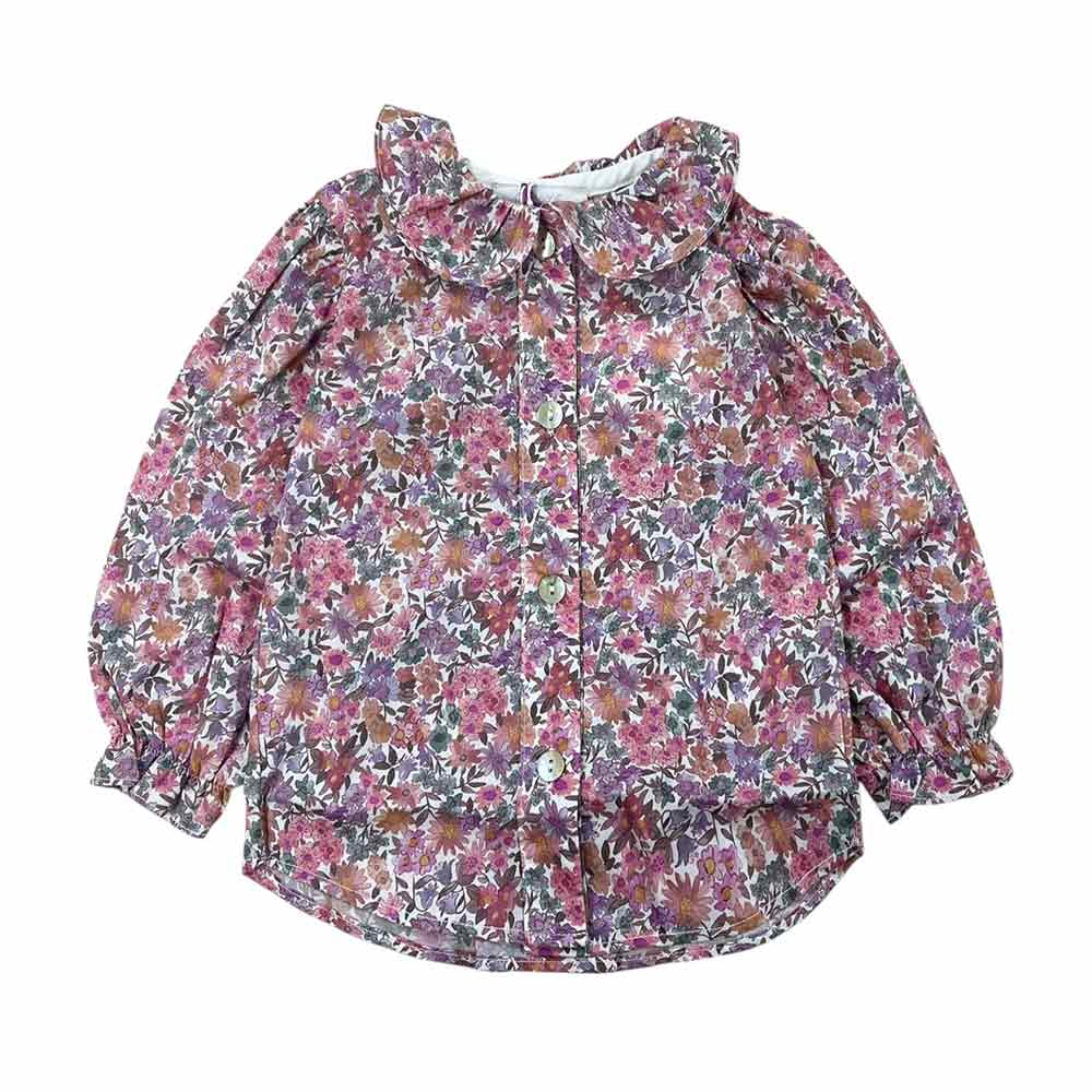 Camicia realizzata in popeline di cotone, caratterizzata da colletto rotondo con ruches, chiusura frontale con bottoncini, maniche lunghe con polsini elasticizzati e orlo curvo. È decorata con fantasia floreale all-over.