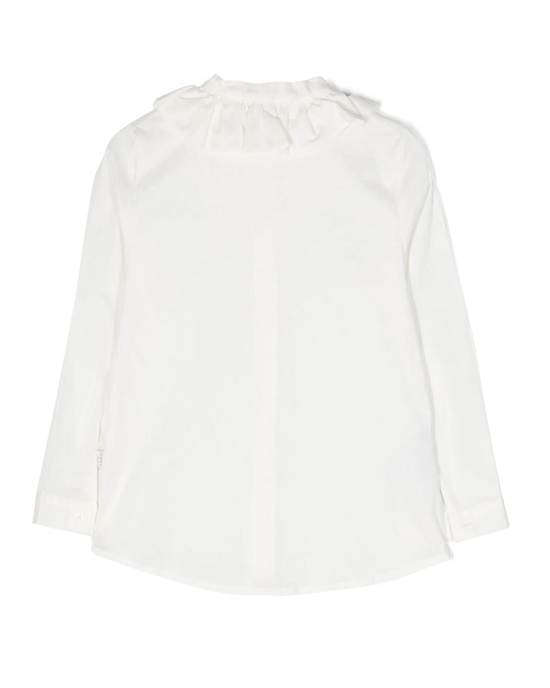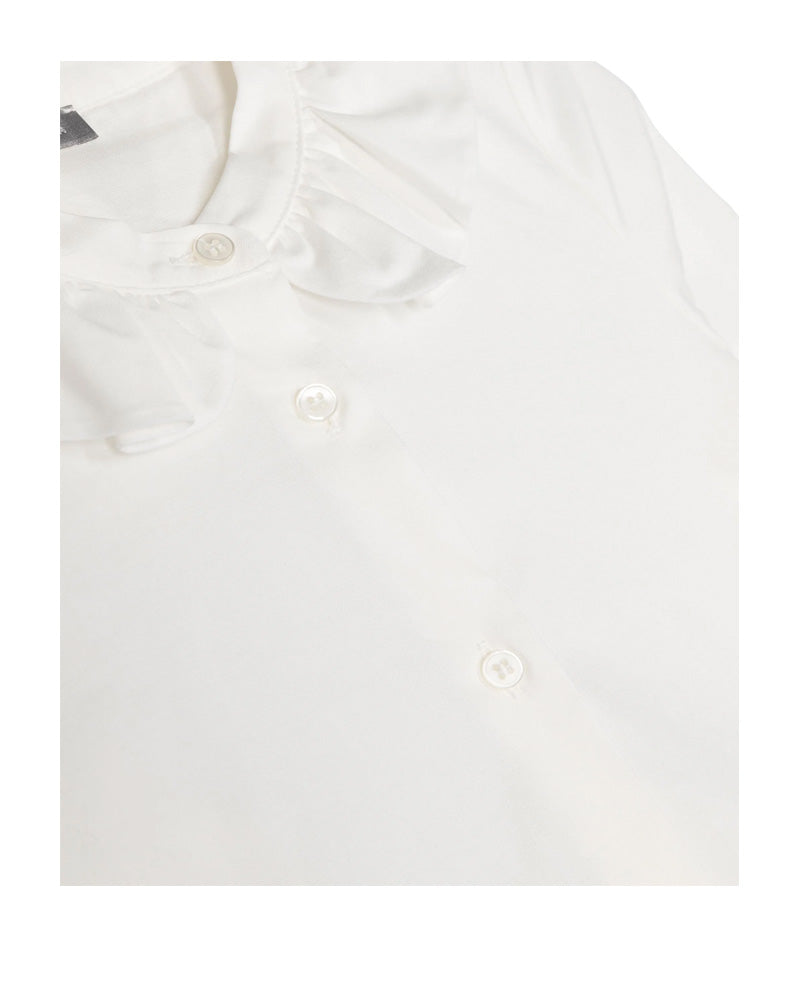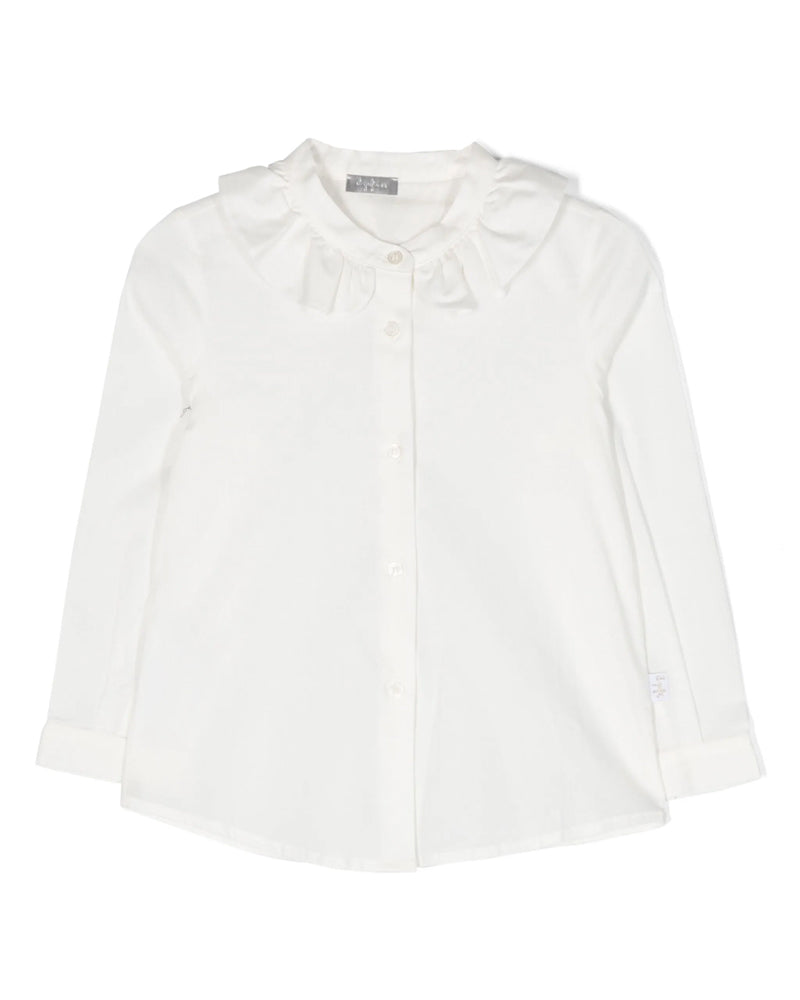 Camicia con dettagli in ruches, chiusura frontale con bottoni, scollo rotondo, maniche lunghe e orlo curvo.