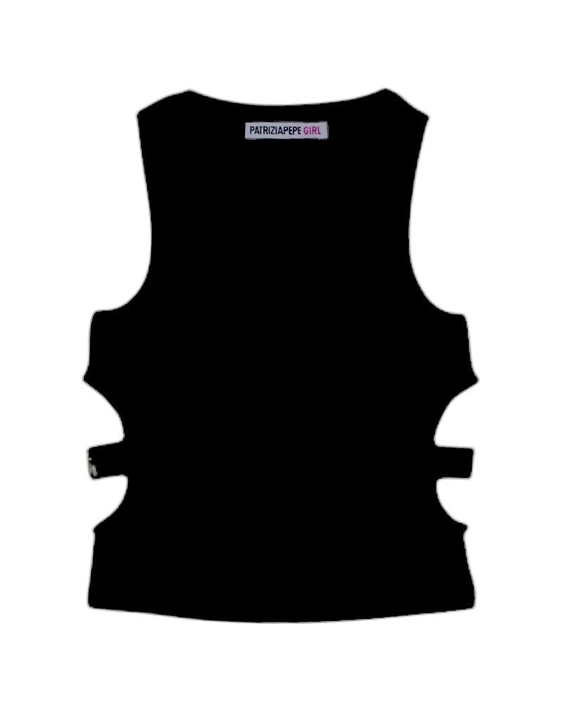 Canotta girocollo a costine da bambina, dettagli cut out laterali con simbolo del brand.