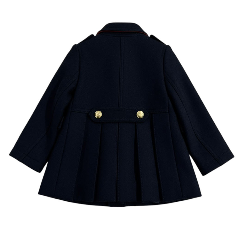 Cappotto doppiopetto realizzato in misto lana, caratterizzato da colletto classico, chiusura frontale con bottoni, maniche lunghe e due tasche con patta sul davanti.